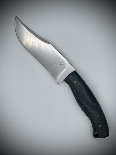 - Manche sur plate semelle en noyer stabilisé, intercalaires G10, rivets aluminium, passe-lanière en fibre de carbone
