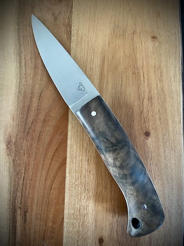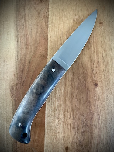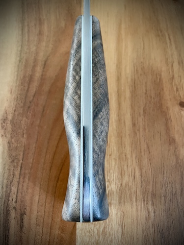 - Manche sur soie cachée en loupe d’érable teintée stabilisée et micarta lin