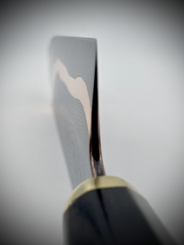 - Tranchant 21cm, hauteur au talon 5,7 cm, épaisseur 2,5mm dégressive, émouture plate totale avec biseaux secondaires